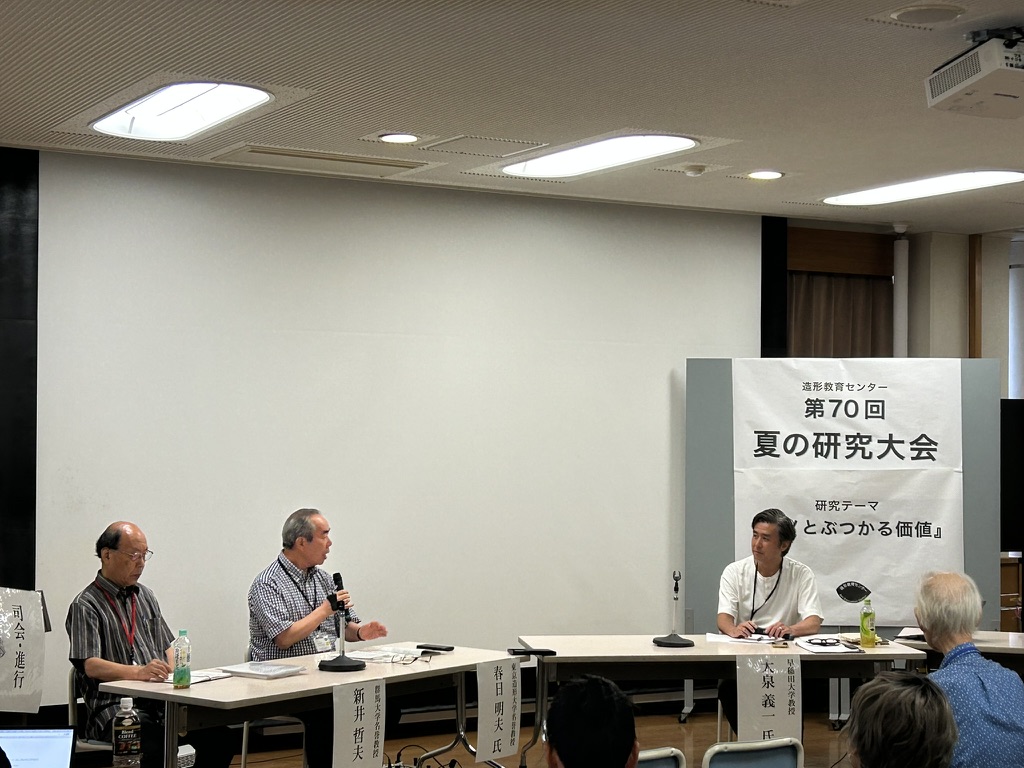 1日目の午後は「造形教育の歴史を再考し未来を臨む」という表題で,新井哲夫氏,春日明夫氏,大泉義一氏に講演をしていただき,3名の鼎談,そしてフロアーとの交流からこれまでの造形教育センターの歴史や,これからの役割について議論をしていきました。